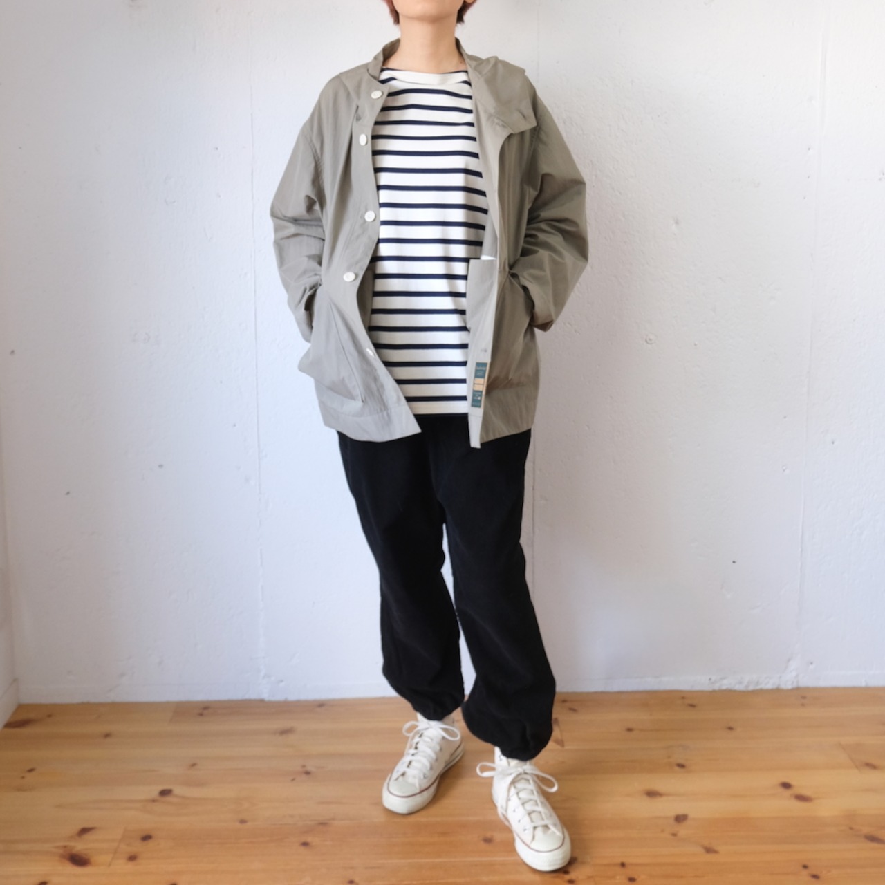 定番アイテムと言えるバスクシャツのデザインですが、ハリとコシがあり一段大人っぽく見える表情に。